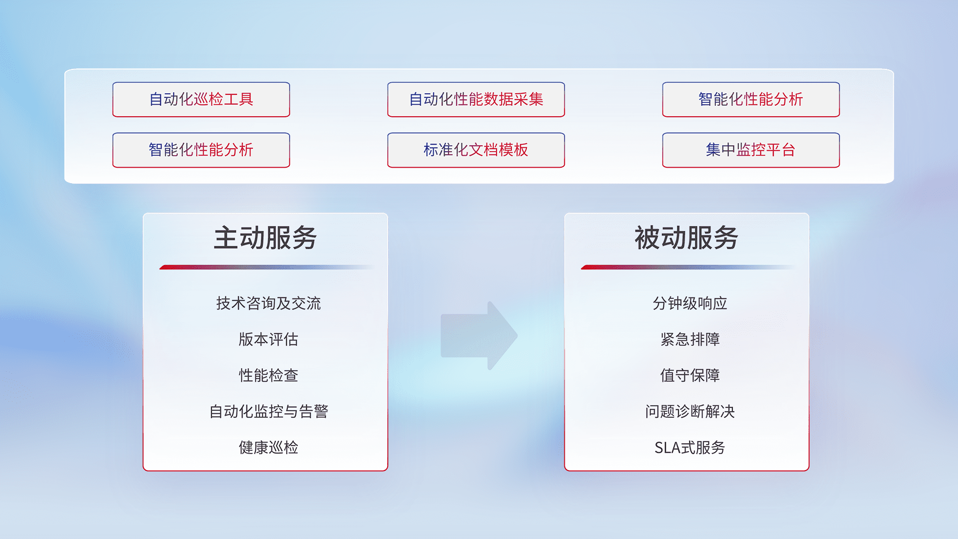 智能化工具和标准化文档,,,保障服务质量,,提供主动服务(包含技术咨询、、、版本评估、、、、性能检查、、、、自动化监控与告警、、健康巡检)和被动服务包含(分钟级响应、、紧急排障、、、、值守保障、、问题诊断解决、、、SLA服务)。。。。